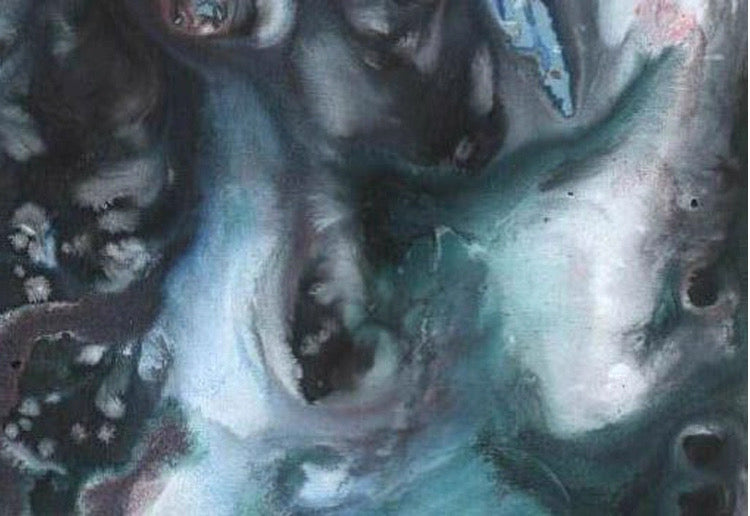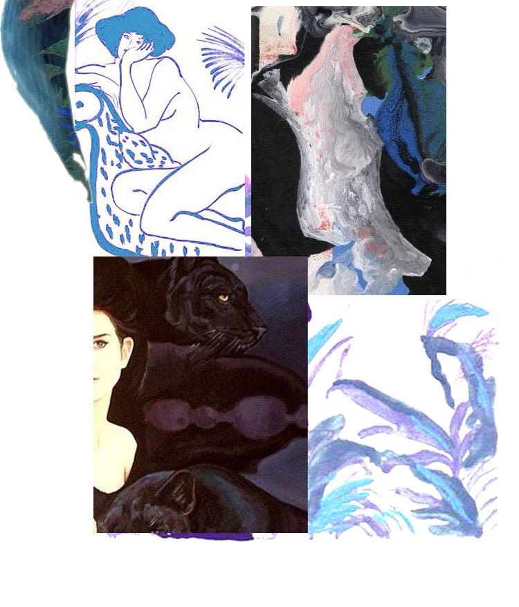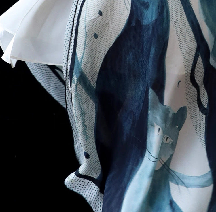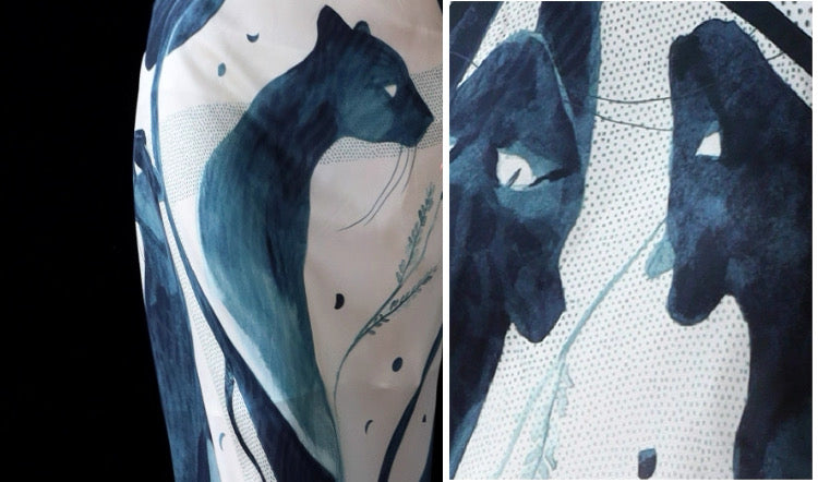 The leopard’s silhouette is reinterpreted through expressive ink-blue color washes and modern abstract blocks, creating a composition that moves between figurative imagery and contemporary art. The leopard motif flows across the fabric like brushstrokes in a painting, forming a dynamic scene where wild energy and elegance coexist.